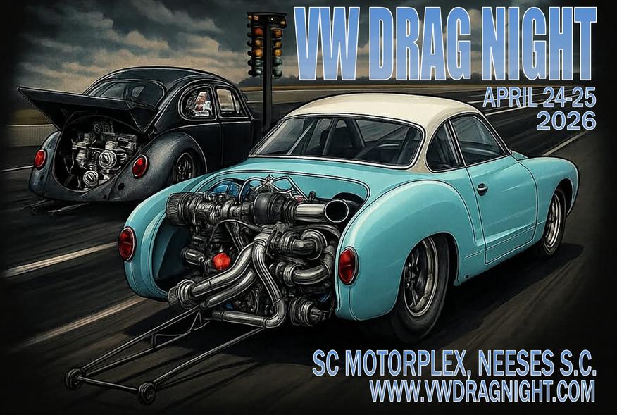 It’s time for the 18th annual VW Drag Night! Join us Friday April 24th at the South Carolina Motorplex in Neeses S.C. for test and tune and the return of the Instant Green King class! The gates will open at 5 pm. Saturday April 25th we will then return to the track for the main event. The gates will open at 10am. It will be $20 to enter. We’ll have drag racing, show cars, music, food, raffles, vendors, a swap meet and much more! We will have the Aircooled Streetcar Association (ASA), ECPRA Pro Stock, Pro Outlaw, Super Pro and Pro, and the ladies only class Draggin' Booties on the track all day and night. We will also have a Junior Dragster class, motorcycle classes and a Gamblers class. The drag race purse is over $12,500. We will give away a 1965 VW ragtop Beetle. Following the awards and payouts we will have a late night DJ party with free food. Schedule and payout coming soon. For more information call Scott at 843-270-7208. We'd love to see you here this spring!